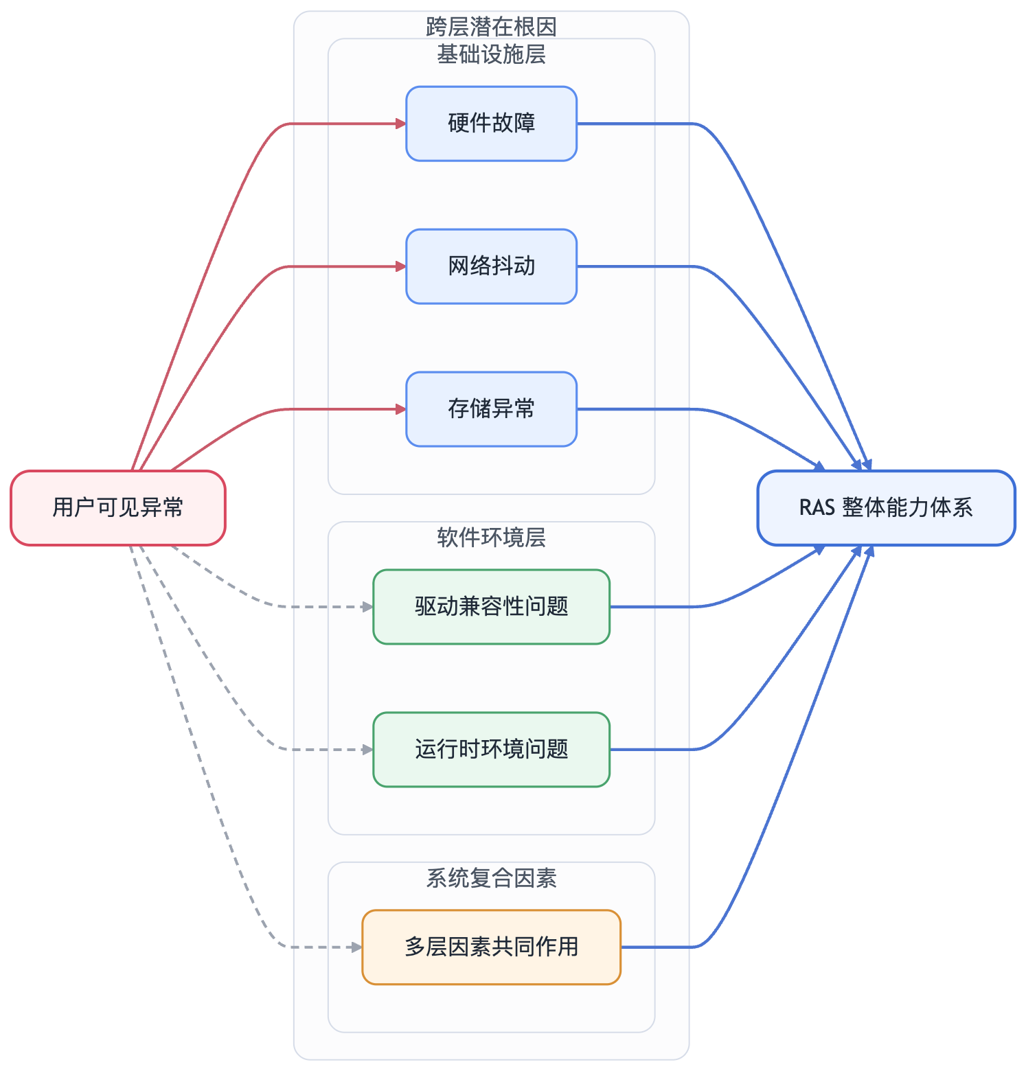 例如,用户看到的可能只是任务中断、训练速度下降、通信超时、进程挂起、推理时延抖动或吞吐下降,但这些现象背后的根因并不一定发生在同一层。问题可能来自硬件故障、网络抖动、存储异常、驱动兼容性问题、运行时环境问题,甚至可能是多个层面共同作用的结果。也正因如此,训练平台与推理平台的 RAS 建设,已经无法继续停留在“告警加人工排查”的传统模式上,而必须逐步演进为一套面向任务、面向系统、面向经验闭环的整体能力体系。